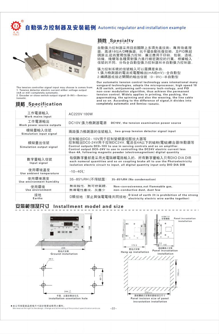 东莞天机传动(台湾天机牌)生产厂家销售的半自动张力控制器又称卷径型半自动张力控制器或者演算型半自动张力控制器。产品采用进口原材料,台湾生产加工技术,并且通过ISO9001质量体系认证和CE认证,质量放心可靠。