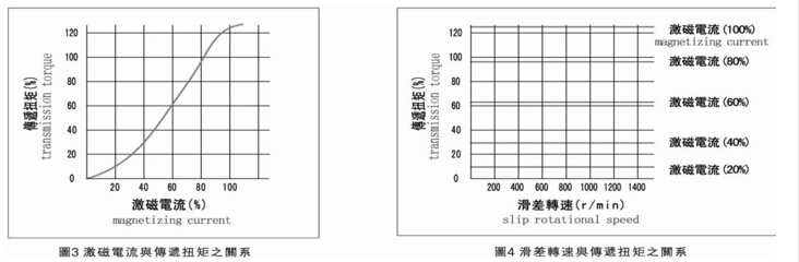双伸出轴磁粉离合器传递的转矩与激磁电流基本成线性关系(正比例关系),只要改变激磁电流的大小,便可在较大的范围内控制扭矩的大小。如果激磁电流保持不变的话,其传递的转矩是不受主动件与从动件之间的转速差(滑差转速)的影响,因此,对轴式磁粉离合器的静摩擦转矩与动摩擦转矩基本是没什么差异的,说明容易进行扭矩控制,如下图: